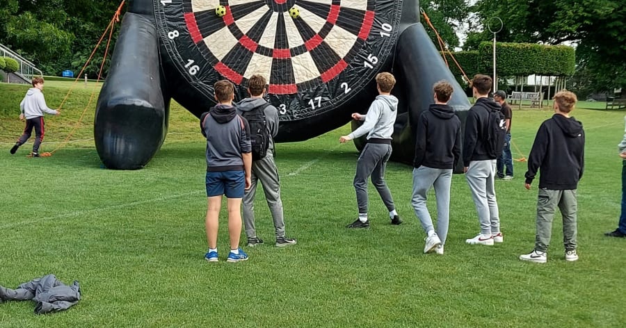 The aim of the game is to kick Velcro footballs at this huge 23ft high inflatable dart board.