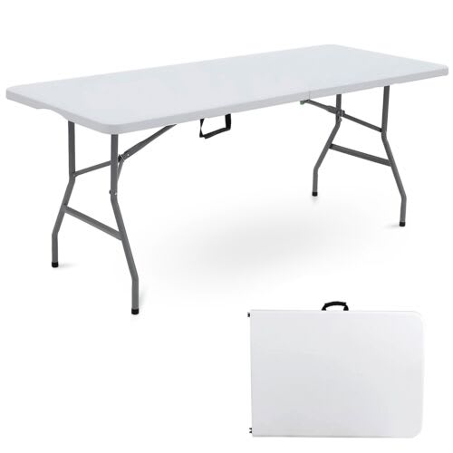 Heavy duty superior quality table is suitable for both indoor and outdoor use. Made from high-density blow moulded plastic with powder coated steel framework. The easy-to-maintain and durable smooth surface is very easy to keep clean. Along with various other uses these table and chairs are ideal for the garden, parties, bbq's, market stalls and trade shows. The tables are easy to set-up and fold-away when not in use. The table can be folded and locked and comes with a handle for easy transportation.