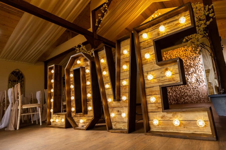 With our Rustic Love Light Up Signs in Essex, you can add a unique and memorable touch to your wedding. Elevate your venue styling and let love shine through these stunning illuminated letters. Our signs are not just decorations; they are a centerpiece, a photo opportunity, and a perfect way to light up your love story.